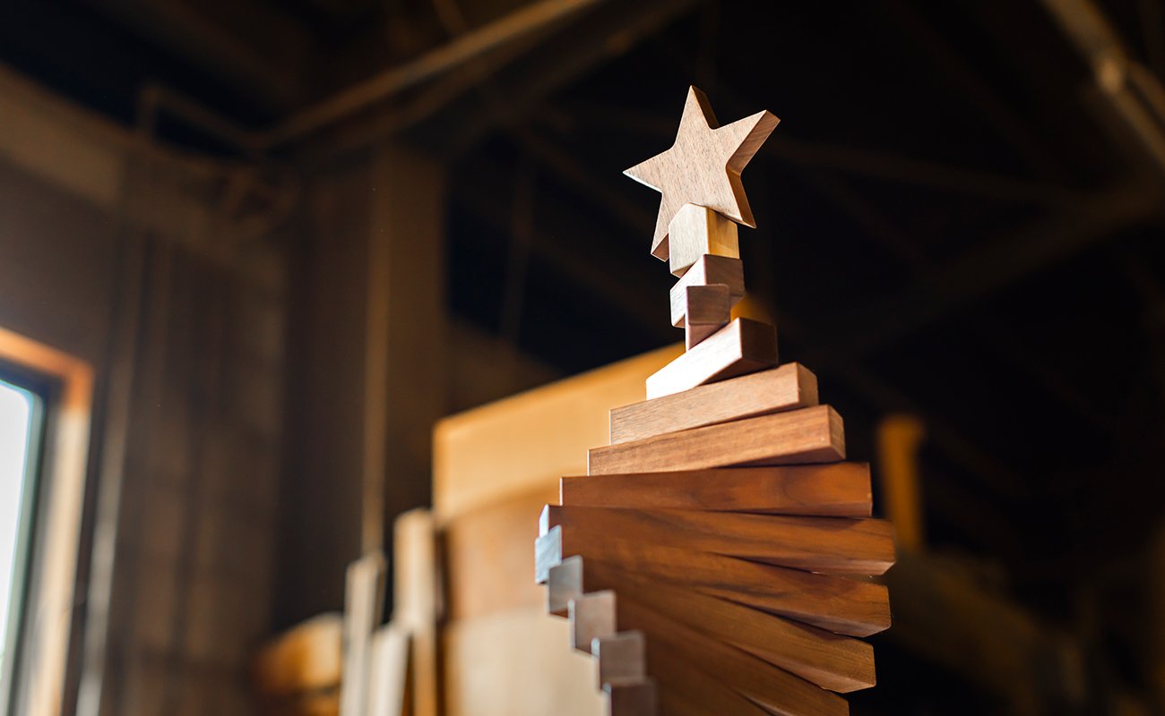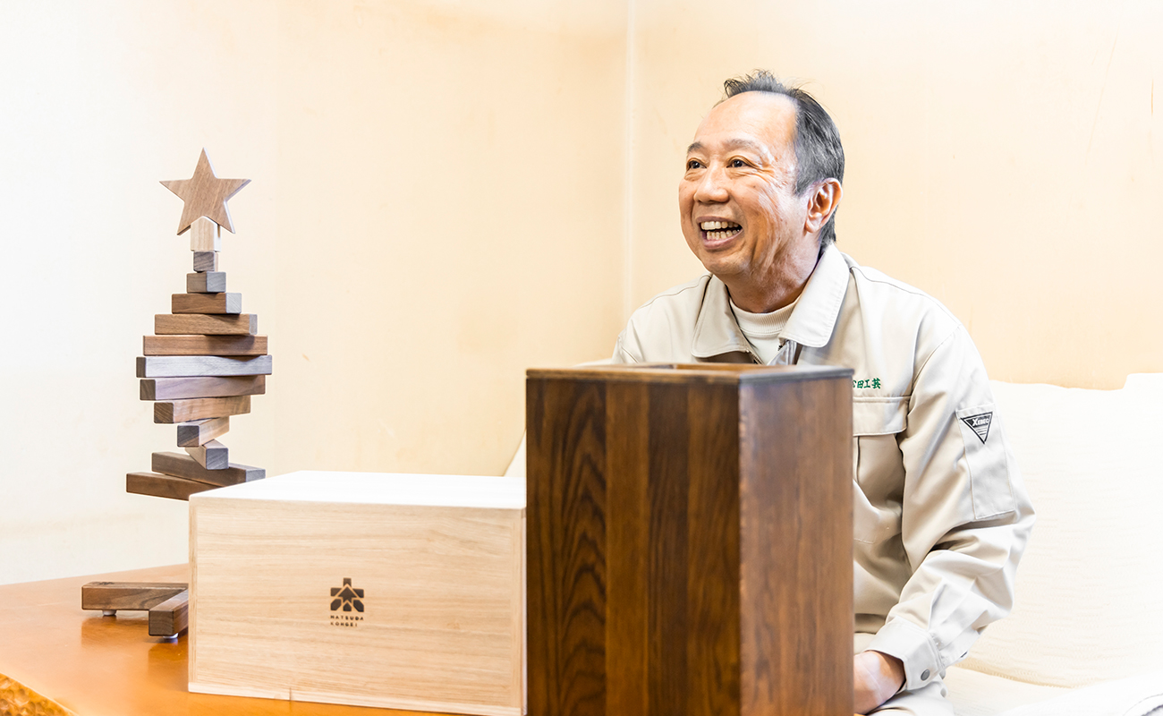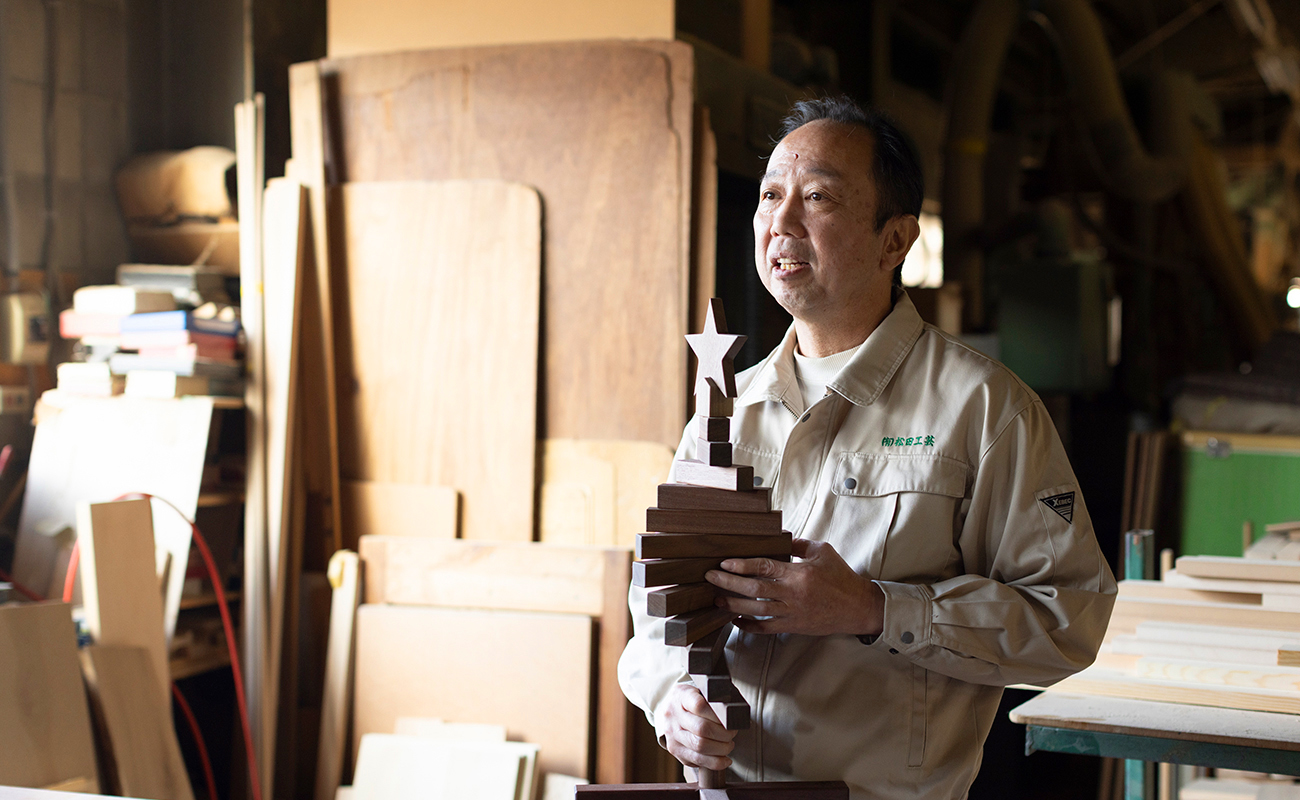 本物志向の方をターゲットに、松田工芸ならではの職人技術を生かせる商品づくりを目指しました。その取り組みの一つが「クリスマスツリー」の商品開発です。きっかけは、「オール無垢材、しかもウォールナットとオークの2種の高級木材でクリスマスツリーを作れませんか?」という加納社長の“無茶ぶり”でした(笑)。てっぺんの星の加工一つとっても、ウォールナットは材質が硬く、加工が難しいんです。小さくなるほどけがのリスクは大きくなりますが、それを可能にするのはうちならではの技術力です。結果的に自由に形をアレンジできる今の仕様になるまでに、加納社長と二人三脚で2年ほど試作を重ねました。